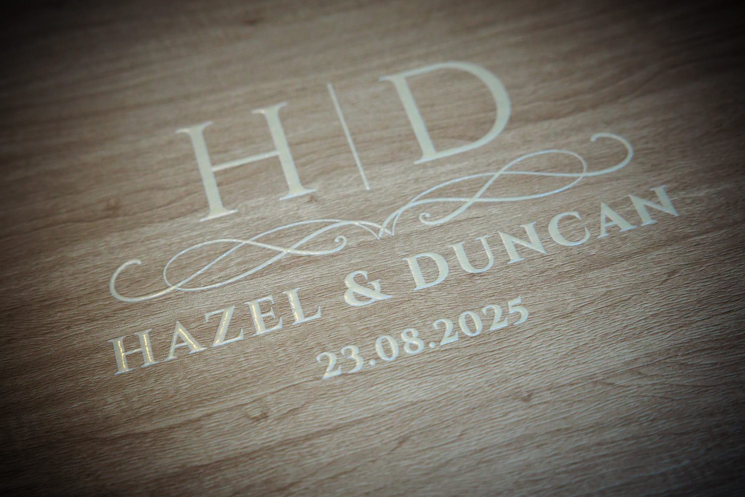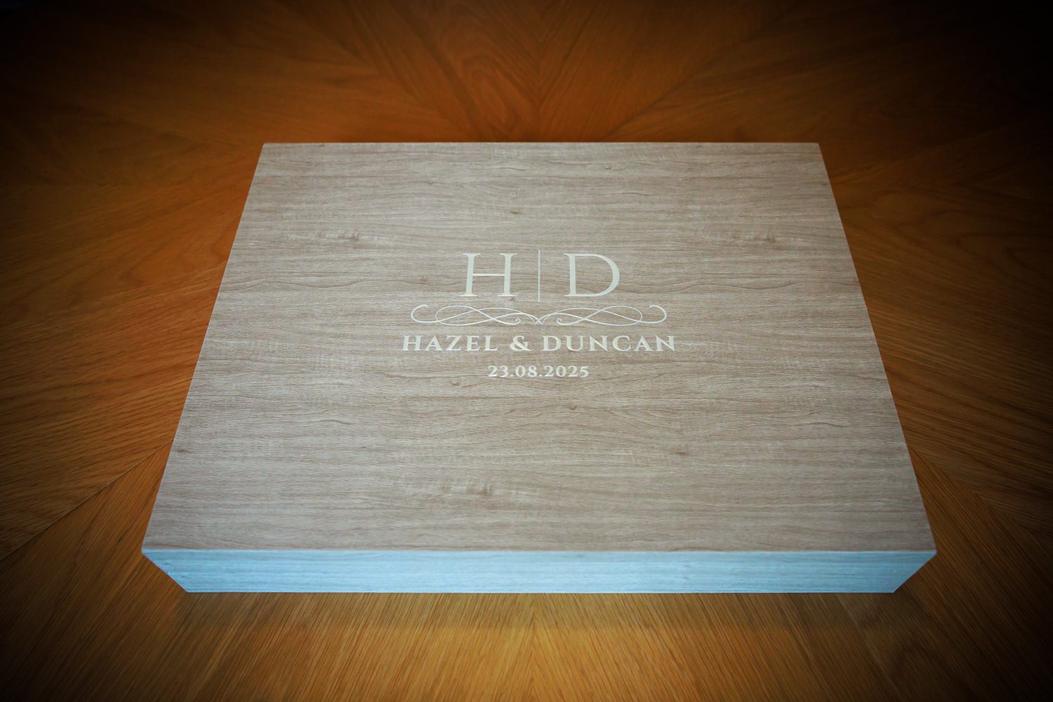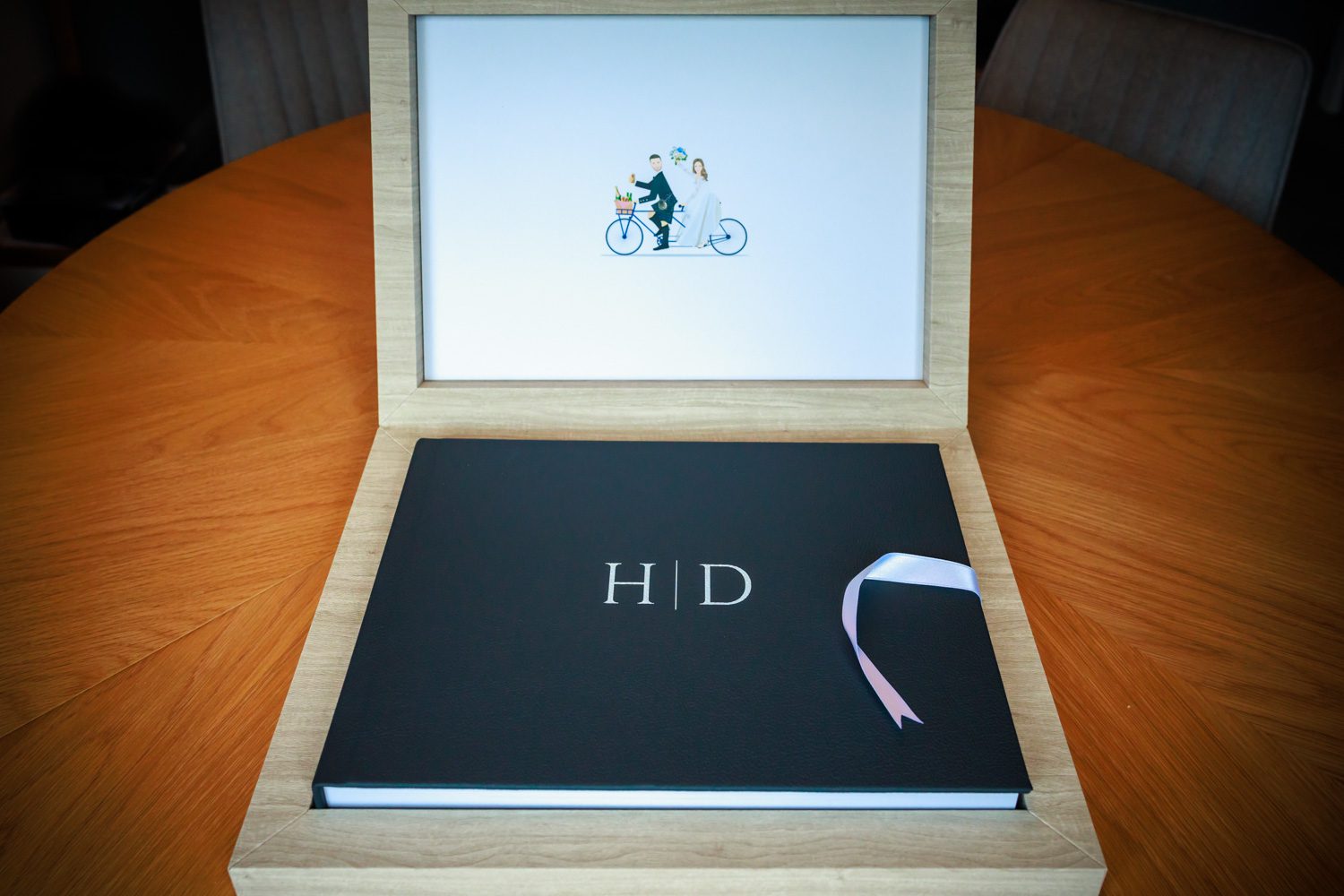 For the album, Hazel & Duncan had the idea of incorporating artwork from their invites into the design and also came up with their own bespoke design for the cover of both the album and box. For the box cover, the full design was overlaid on to a warm grey maple material with just their initials part of the design then used for the album cover, overlaid on to a midnight blue leather material. The invite artwork was added to the inside of the box lid on a plain white background and fininshed off with a white ribbon. And, it looked stunning!